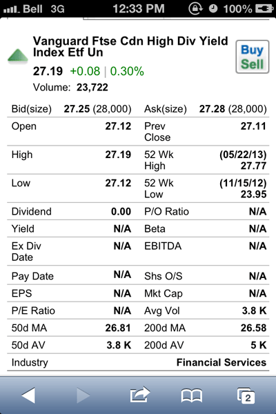 Looking up information on ETFs was an interesting experience in that the quotes returned less detail than a stock quote and sometimes provided information inconsistently. Information on the technical movements (e.g. 200d moving average) or the dividend yield were not provided consistently or at all in some cases. A quick test of two Canadian dividend oriented ETFs XDV (left image below) and VDY (right image below) showed no dividend related information in the quotes fields and only the latter had technical information (200d & 50d moving average and volume) populated.