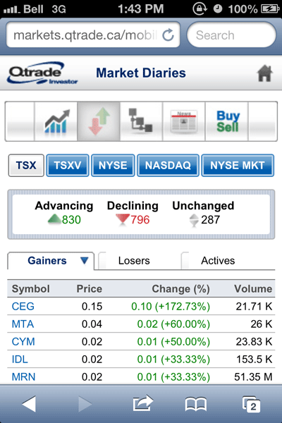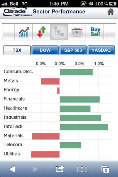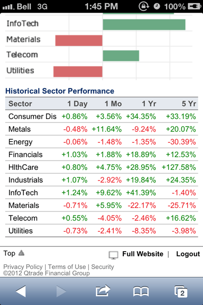 With Qtrade’s mobile website it is possible to research markets by sector of company for the major US indices as well as for the TSX and it is also possible to see changes across different time frames. This is a particularly nice feature as it lets users quickly spot and track sector performance using tables and graphs from a mobile device.